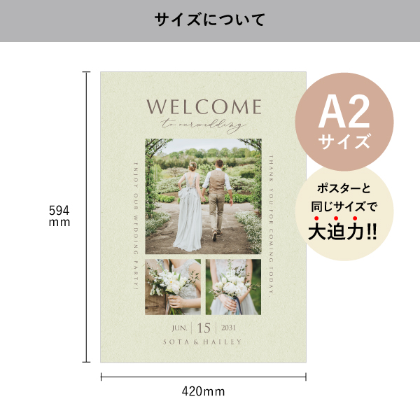 フラットなフォルムにデザインが大きく入るA2サイズのパネルは、ゲストをお出迎えするウェルカムボードとしてピッタリです!おふたりの代わりにゲストをお出迎えするウェルカムボードは、存在感があり見ごたえ抜群!A2サイズはポスターと同じ大きさで、A3サイズと比べても圧倒的な迫力!遠くからでもゲストの目を引きます◎広い会場やガーデンウェディングなど開放的な場所に設置するのもおすすめです♪オシャレなサインを置いて、受付スペースも華やかに!