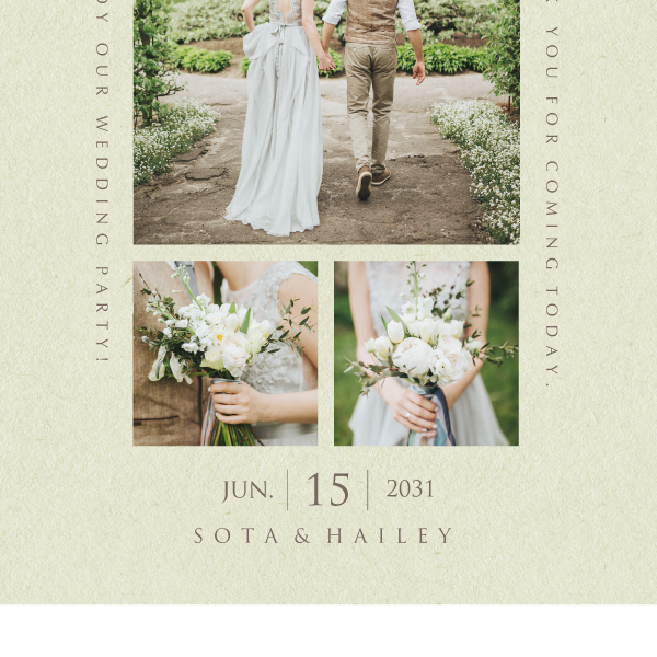 ナチュラルさを感じるくすみカラーとスタイリッシュなデザインが、優しくおふたりを包み込んでいるかのように”最高の瞬間”を際立たせてくれる。優しい印象のグリーンカラーはナチュラルウェディングはもちろん、ホテルウェディングやカジュアルウェディングにも相性◎