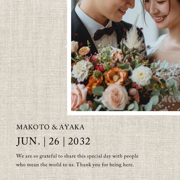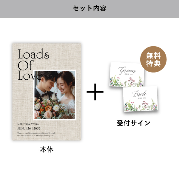 | 無料特典 | 受付サイン1組(新郎用×1組、新婦用×1組) |