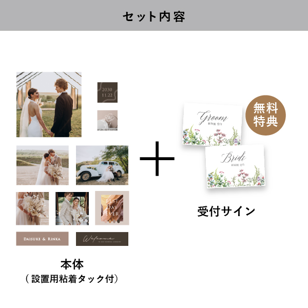 | 無料特典 | 受付サイン1組(新郎用×1組、新婦用×1組) |