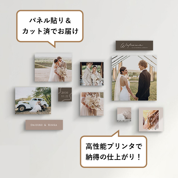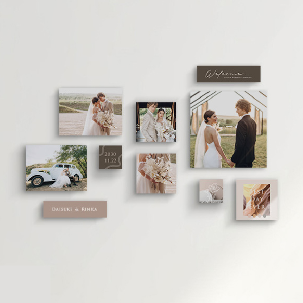 ウェルカムスペースや廊下の壁におふたりの前撮りの写真やお気に入りの写真を貼って、オリジナルの世界観を表現できるフォトパネル。