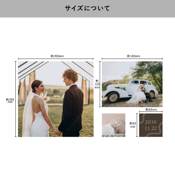 | サイズ | ■写真パネル5枚 約幅163×奥行3×高さ123mm,約幅203×奥行3×高さ202mm,約幅163×奥行3×高さ123mm,約幅103×奥行3×高さ103mm,約幅103×奥行3×高さ103mm ■デザイン固定パネル5枚 約幅163×奥行3×高さ43mm,約幅163×奥行3×高さ43mm,約幅63×奥行3×高さ63mm,約幅63×奥行3×高さ63mm,約幅106×奥行3×高さ106mm  |