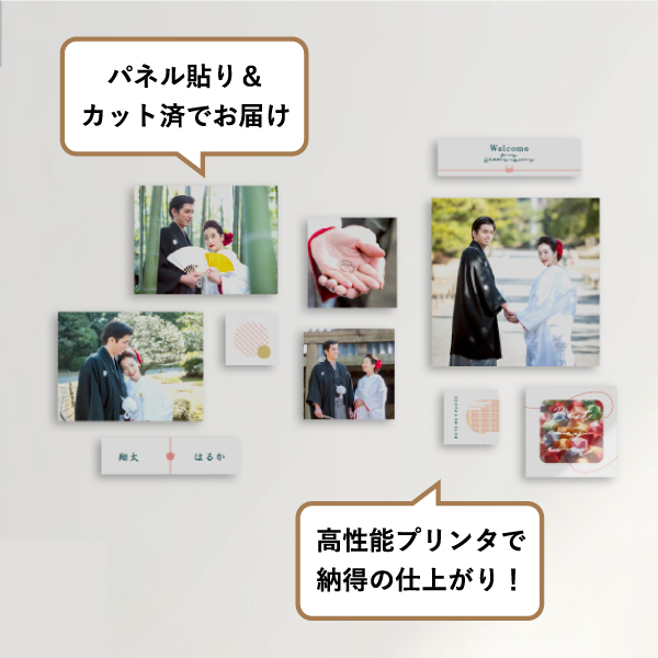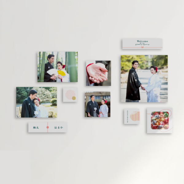 ウェルカムスペースや廊下の壁におふたりの前撮りの写真やお気に入りの写真を貼って、オリジナルの世界観を表現できるフォトパネル。