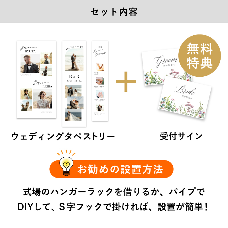 | 無料特典 | 受付サイン1組(新郎用×1組、新婦用×1組) |
