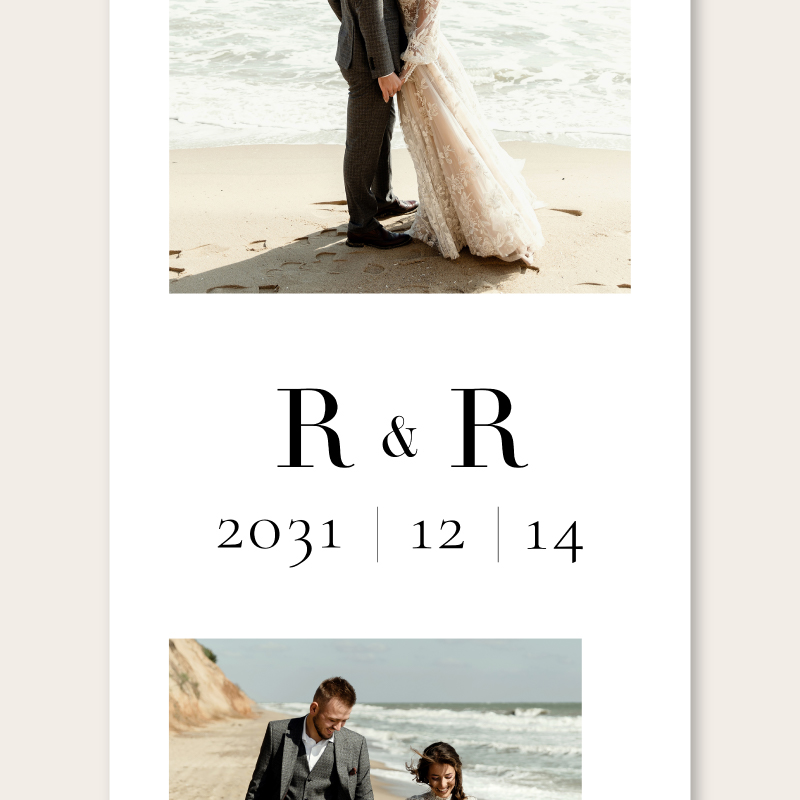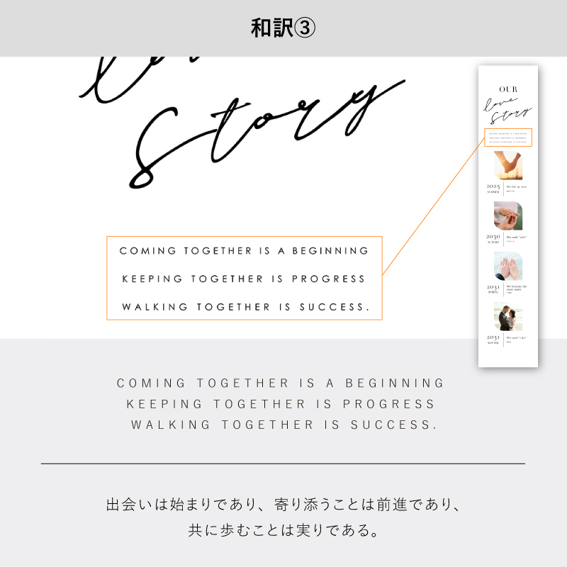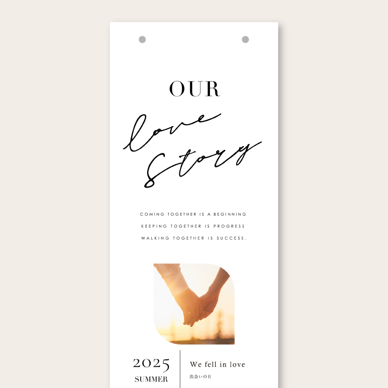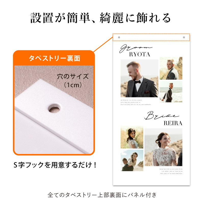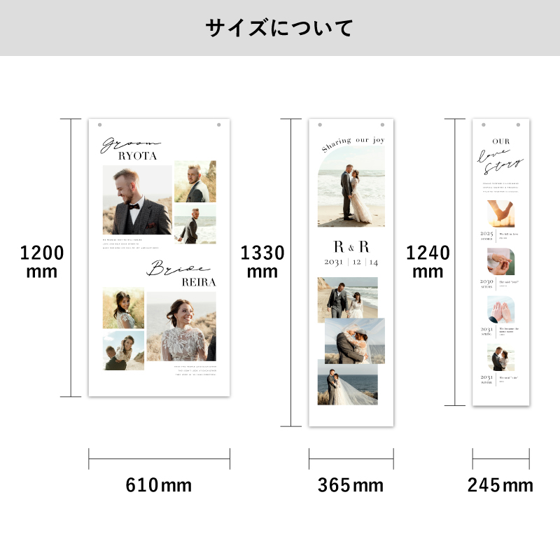 おふたりのお名前やイニシャル、出会いから結婚式までのストーリーが載せられる、サイズの異なる3枚セットのタペストリーです。トレンド感のあるスタイリッシュなデザインがインパクト抜群!異なるサイズのタペストリーを並べるだけで、自然に余白が生まれて抜け感のある配置がおしゃれ度をUPさせてくれます。
