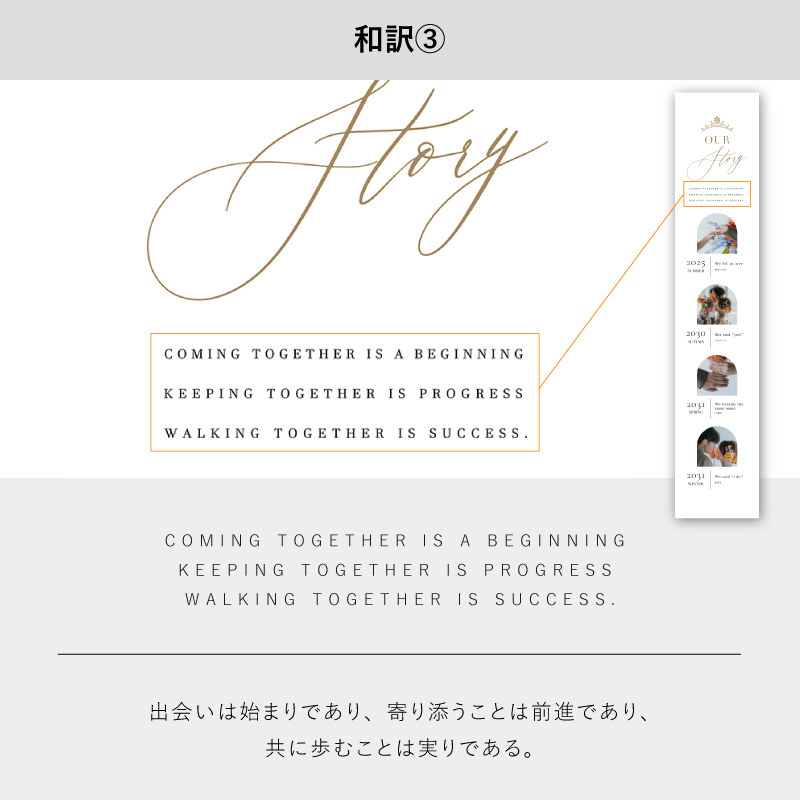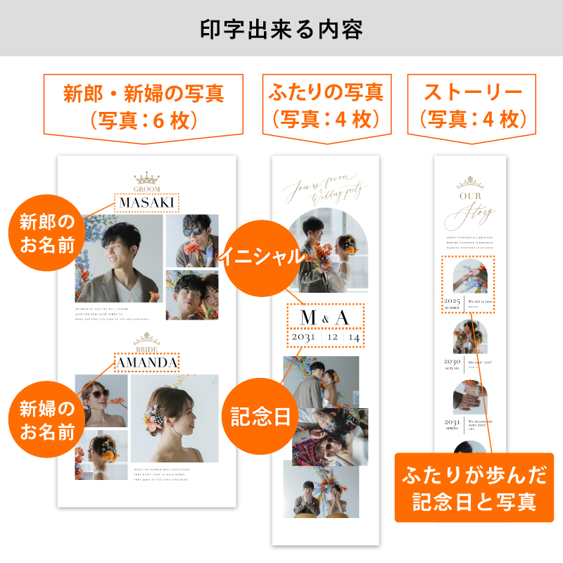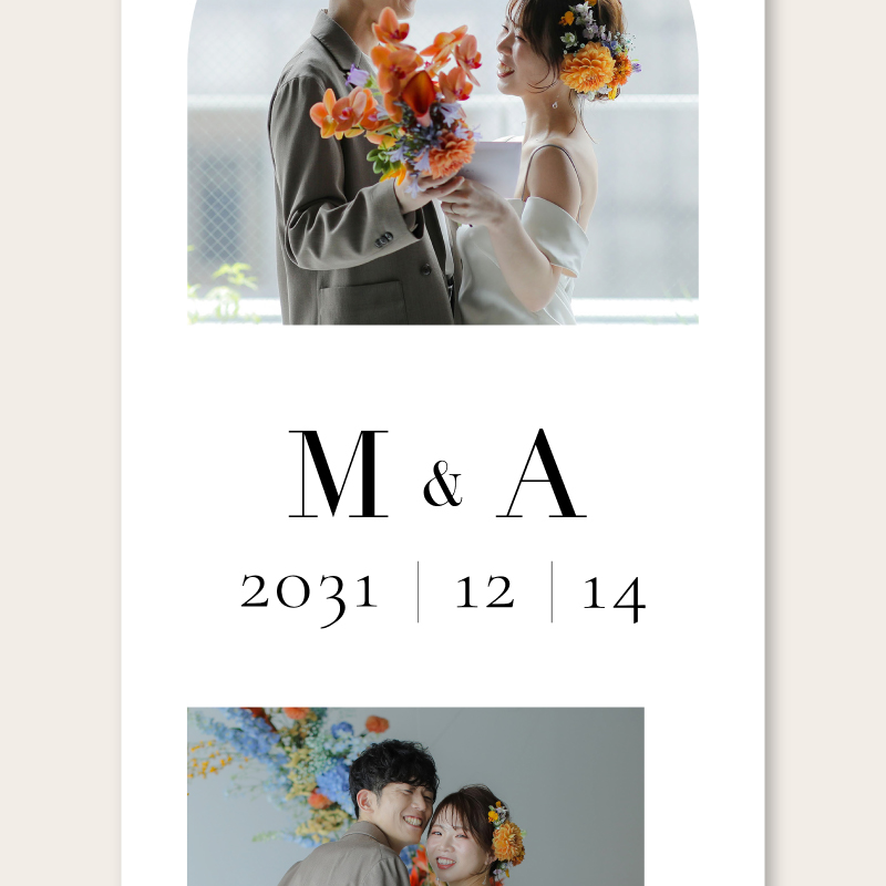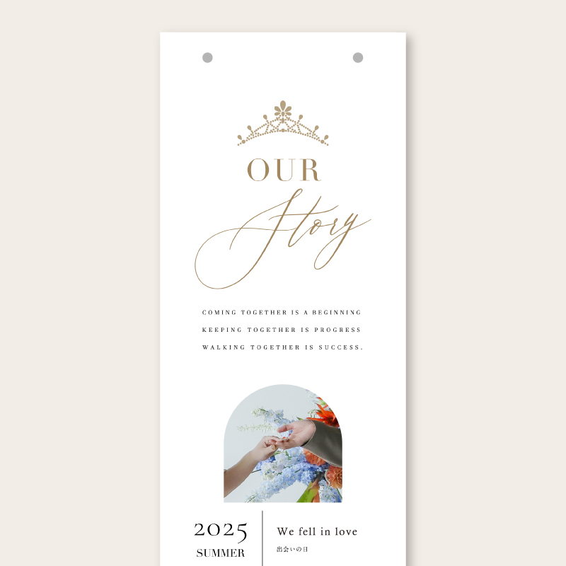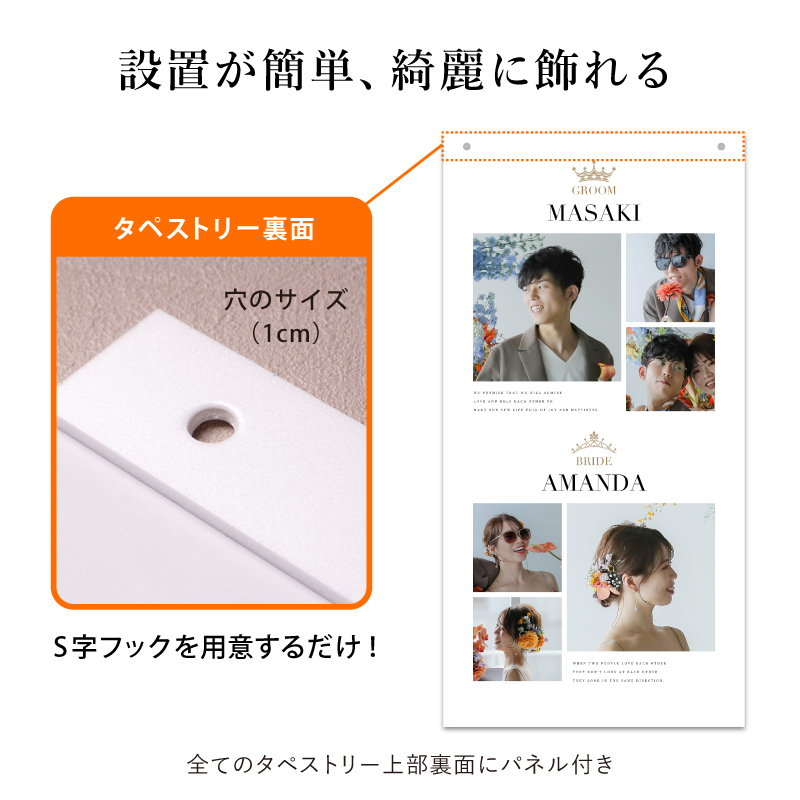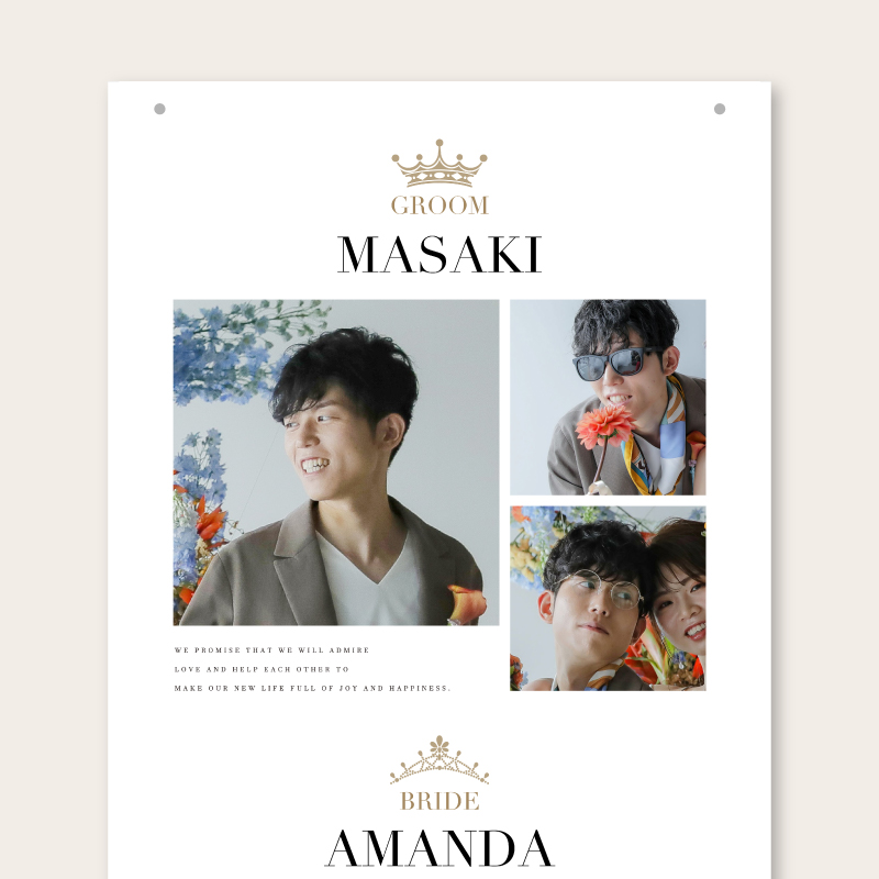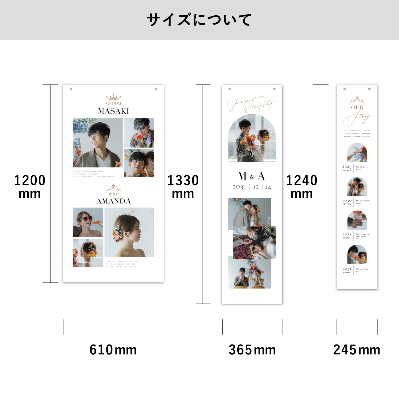 おふたりのお名前やイニシャル、出会いから結婚式までのストーリーが載せられる、サイズの異なる3枚セットのタペストリーです。トレンド感のあるスタイリッシュなデザインがインパクト抜群!異なるサイズのタペストリーを並べるだけで、自然に余白が生まれて抜け感のある配置がおしゃれ度をUPさせてくれます。