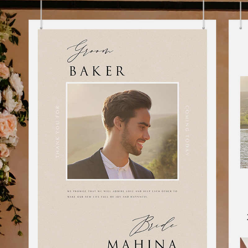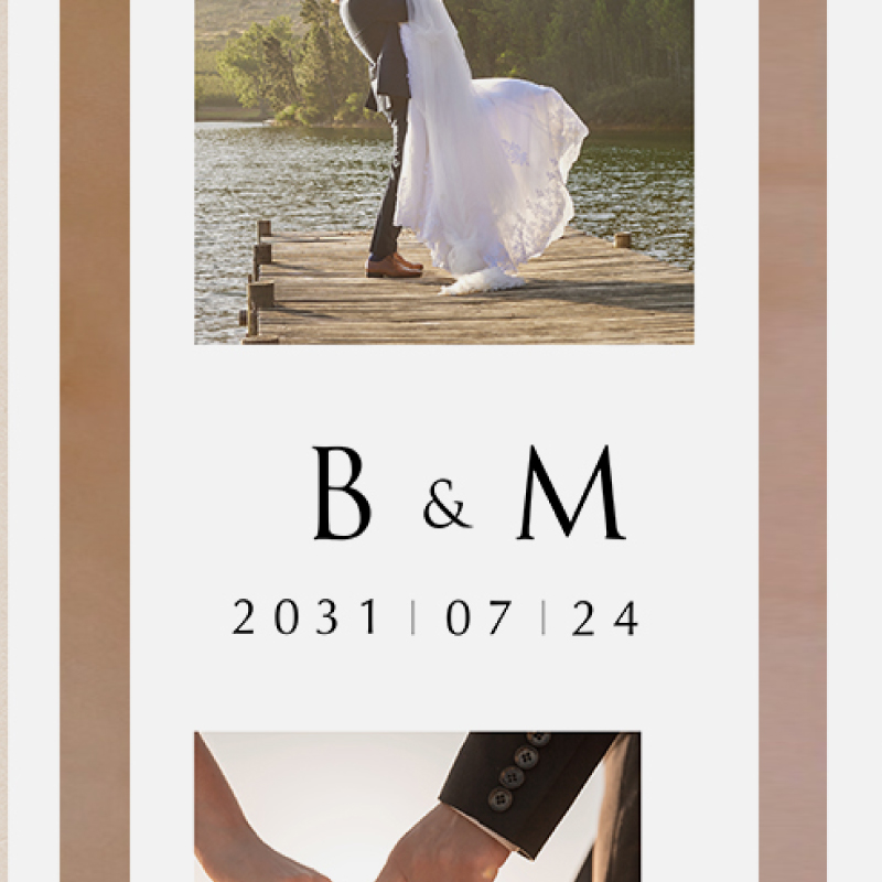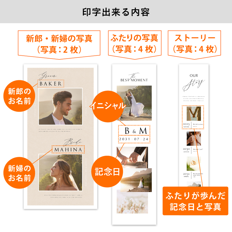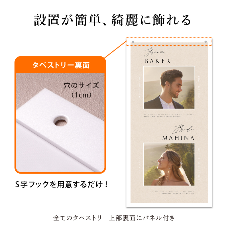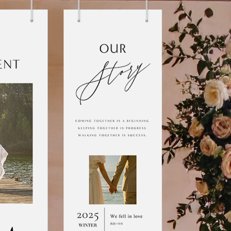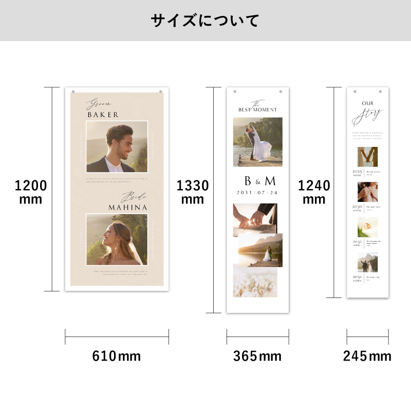 おふたりのお名前やイニシャル、出会いから結婚式までのストーリーが載せられる、サイズの異なる3枚セットのタペストリーです。トレンド感のあるスタイリッシュなデザインがインパクト抜群!異なるサイズのタペストリーを並べるだけで、自然に余白が生まれて抜け感のある配置がおしゃれ度をUPさせてくれます。