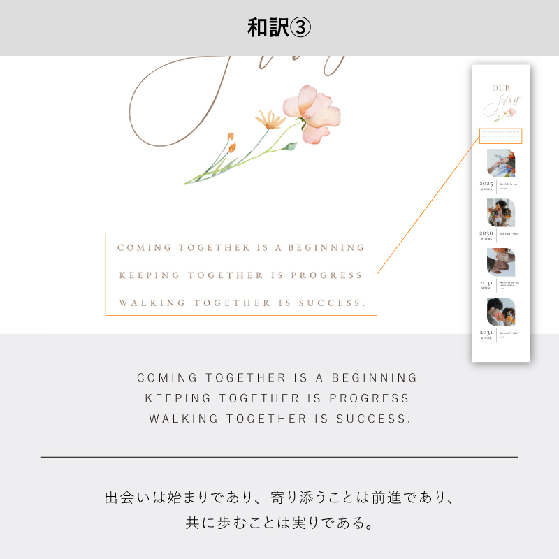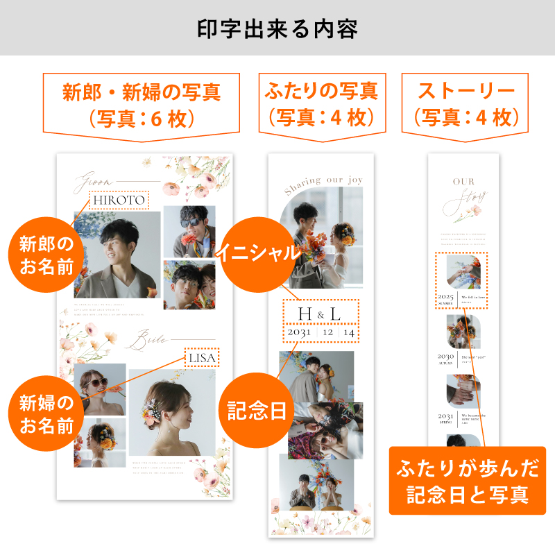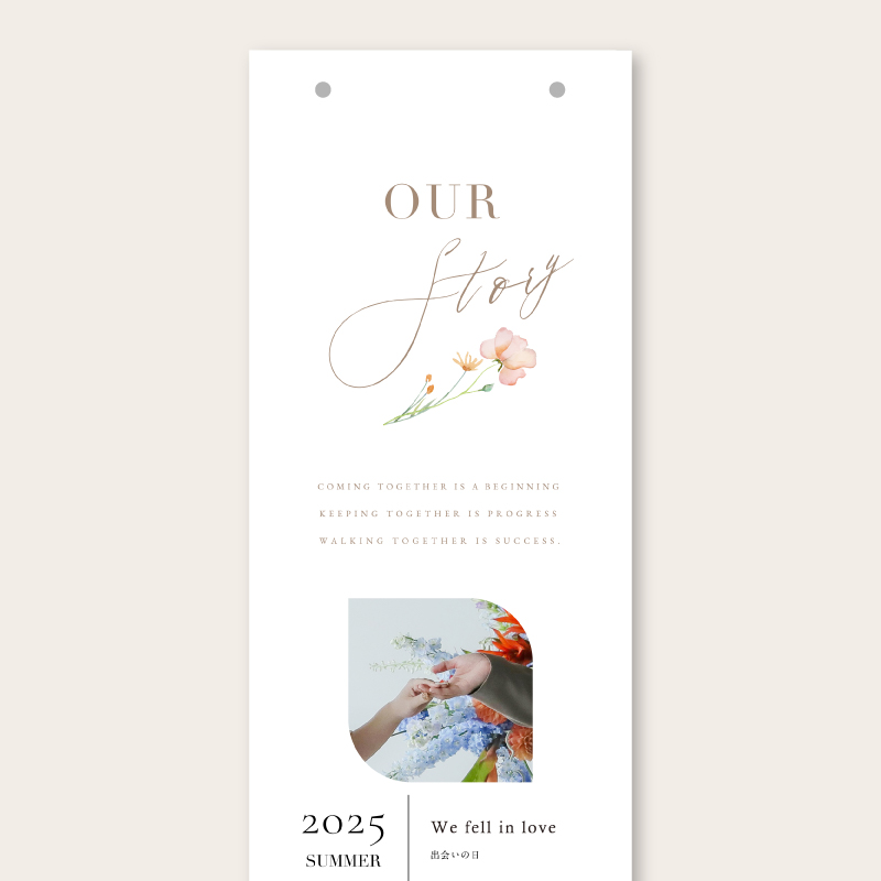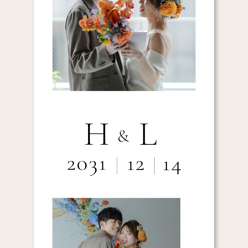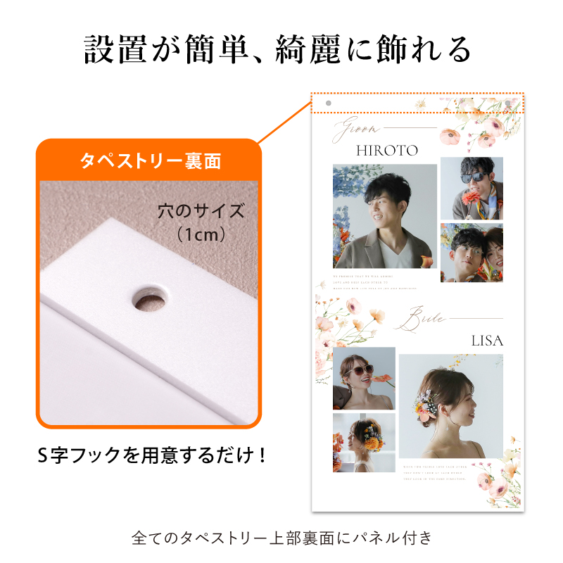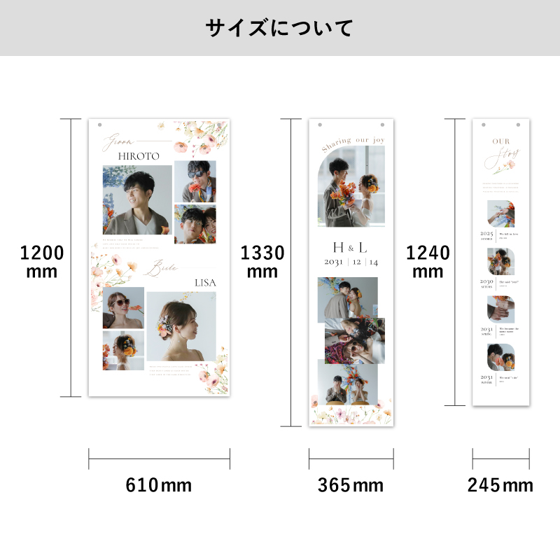 おふたりのお名前やイニシャル、出会いから結婚式までのストーリーが載せられる、サイズの異なる3枚セットのタペストリーです。トレンド感のあるスタイリッシュなデザインがインパクト抜群!異なるサイズのタペストリーを並べるだけで、自然に余白が生まれて抜け感のある配置がおしゃれ度をUPさせてくれます。