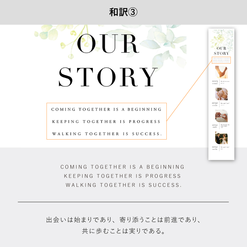 おふたりのお名前やイニシャル、出会いから結婚式までのストーリーが載せられる、サイズの異なる3枚セットのタペストリーです。トレンド感のあるスタイリッシュなデザインがインパクト抜群!異なるサイズのタペストリーを並べるだけで、自然に余白が生まれて抜け感のある配置がおしゃれ度をUPさせてくれます。