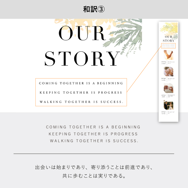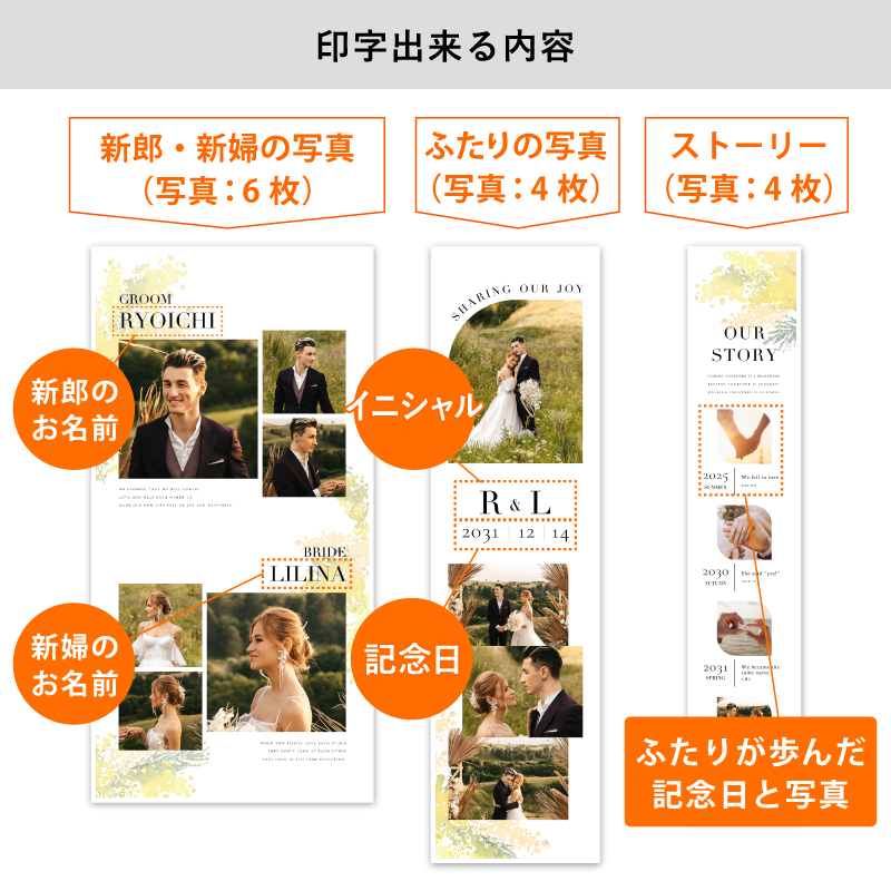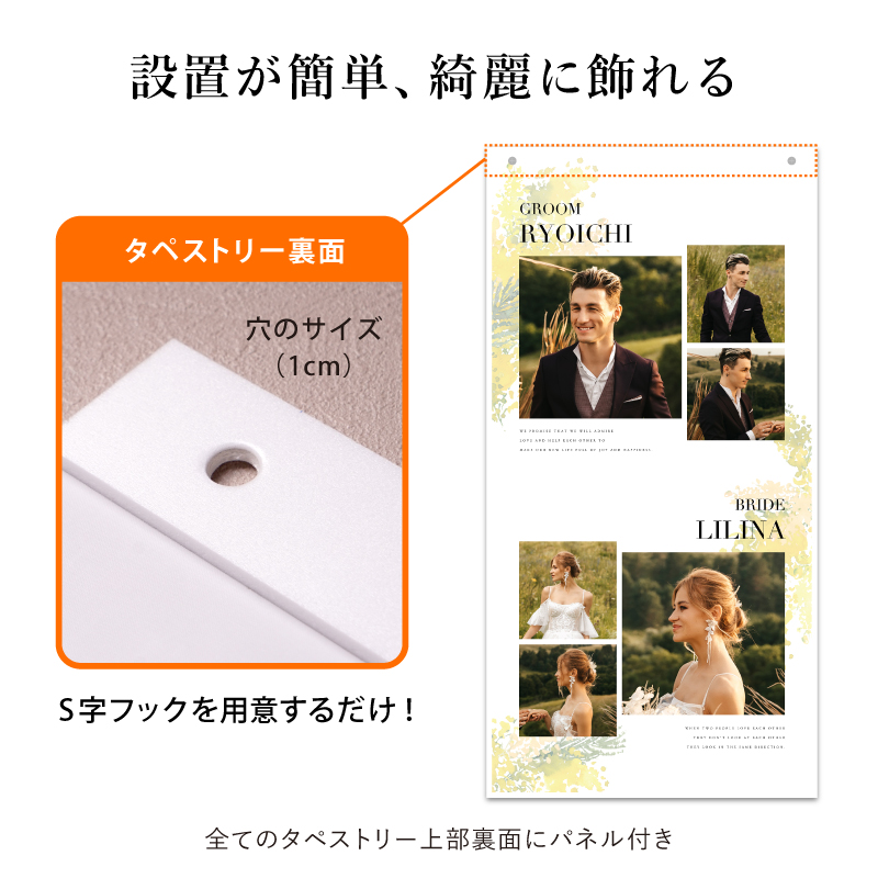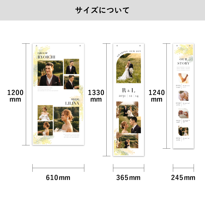 おふたりのお名前やイニシャル、出会いから結婚式までのストーリーが載せられる、サイズの異なる3枚セットのタペストリーです。トレンド感のあるスタイリッシュなデザインがインパクト抜群!異なるサイズのタペストリーを並べるだけで、自然に余白が生まれて抜け感のある配置がおしゃれ度をUPさせてくれます。