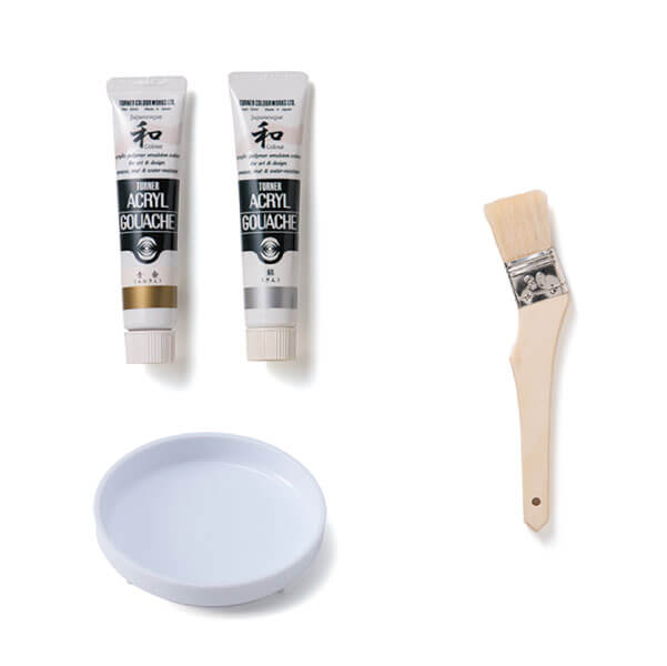 | 内容物 | ■ウェルカムボード×1枚 ■アクリル絵の具:ゴールド・シルバー20ml×各2 ■絵の具皿×2皿 ■筆×2本 |