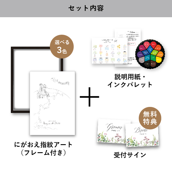 | 内容物 | ■似顔絵指紋アート:1 ■押印用インク ■フレーム(3種類より選択)付き |