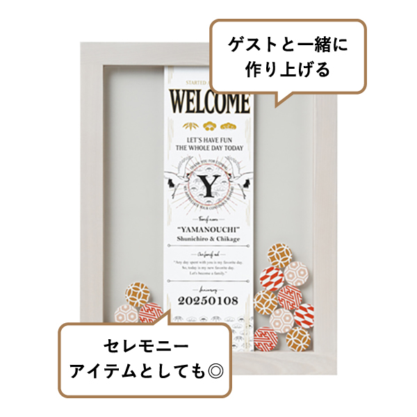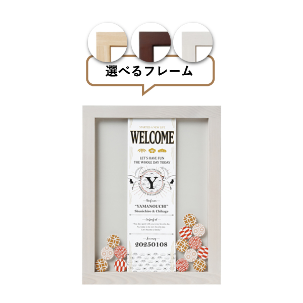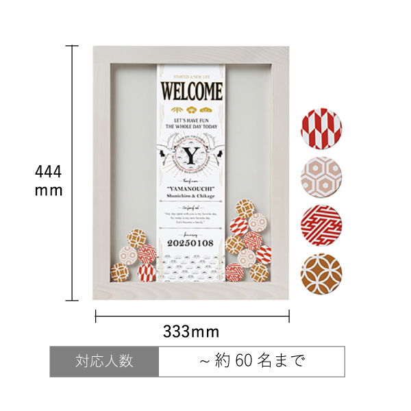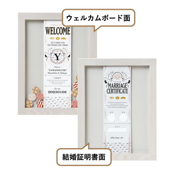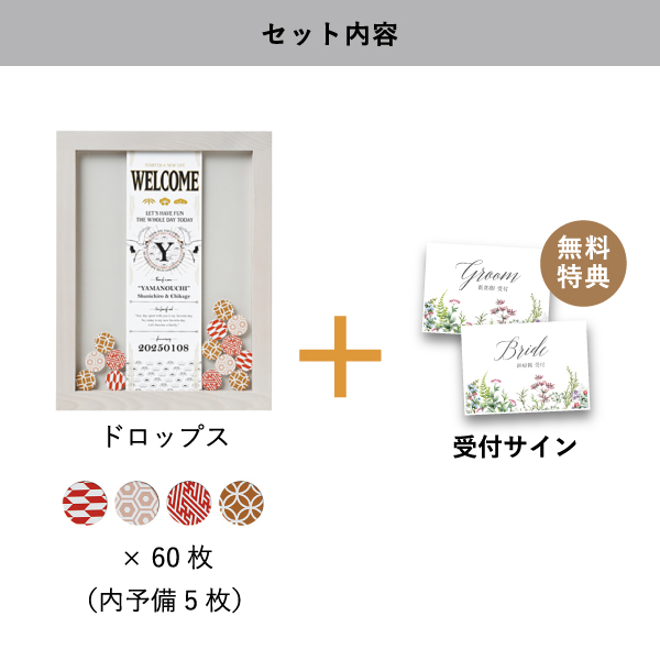 | 内容物 | ■名入れウェルカムボード:1枚 ■結婚証明ボード:1枚 ■承認チップ:60枚(55枚+予備5枚入) フレームつき |