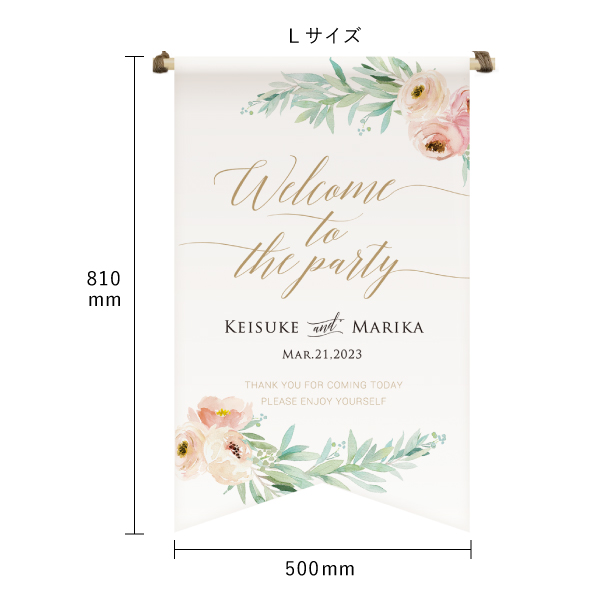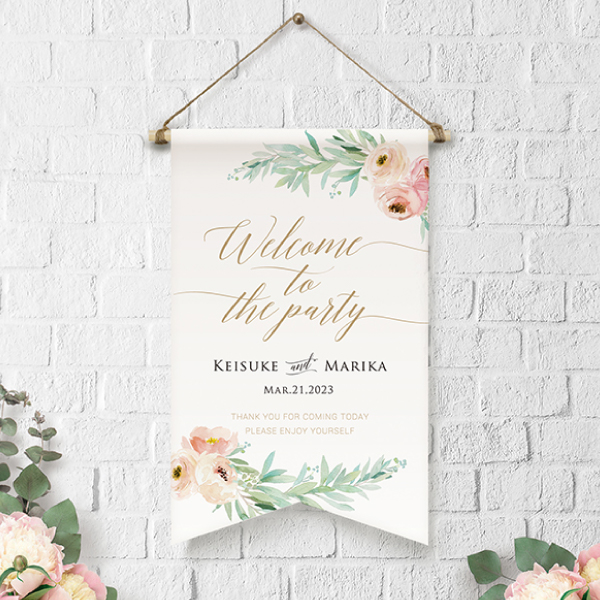 中央におふたりの名前、記念日が入ります。大きく入った「Welcome to the party」の文字が目を惹くアイテムです。
