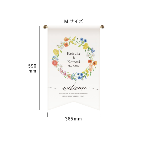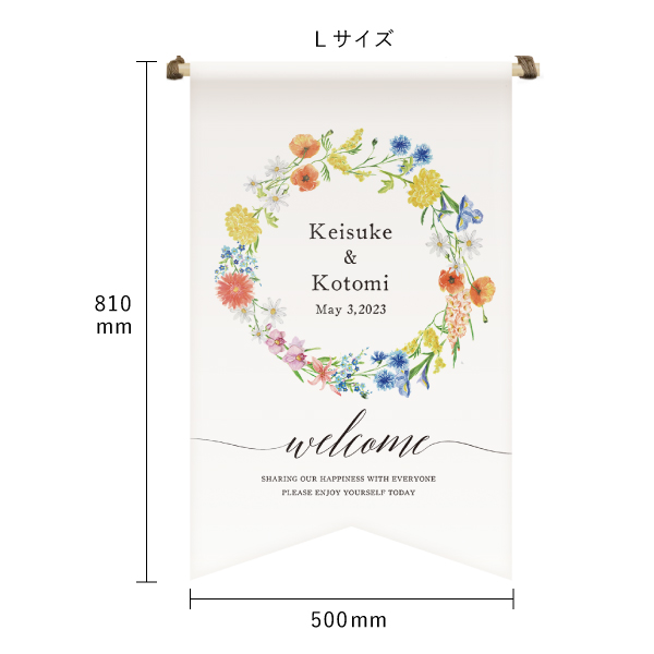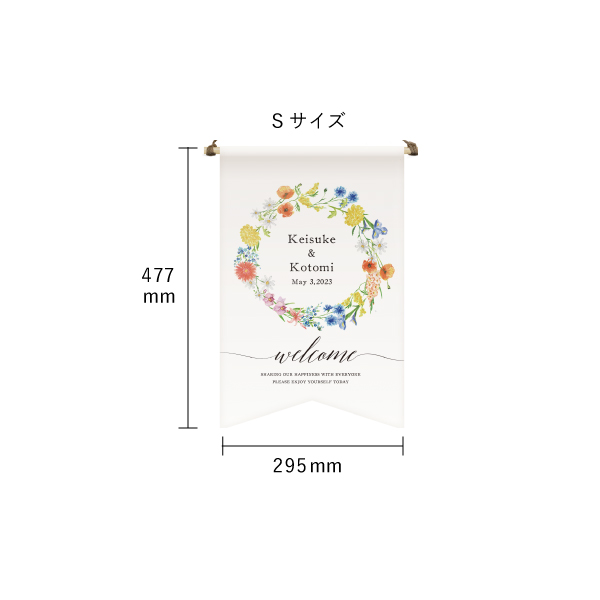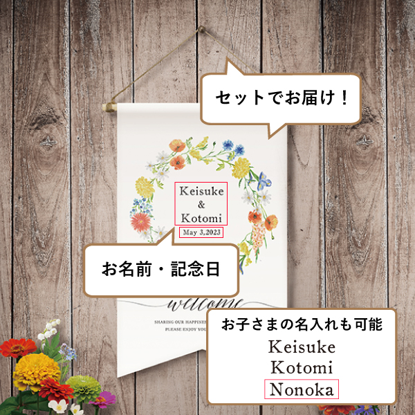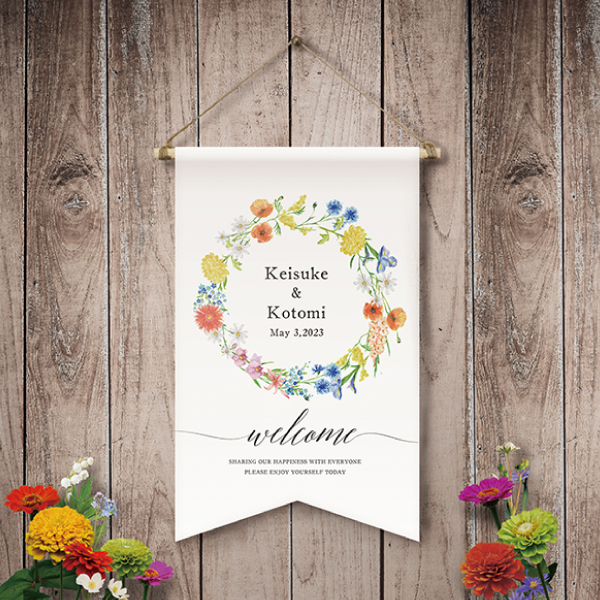 リースの中央におふたりの名前、記念日が入る素敵なフラッグ。色鮮やかなフラワーが、おふたりのウェディングに華を添えてくれます。
