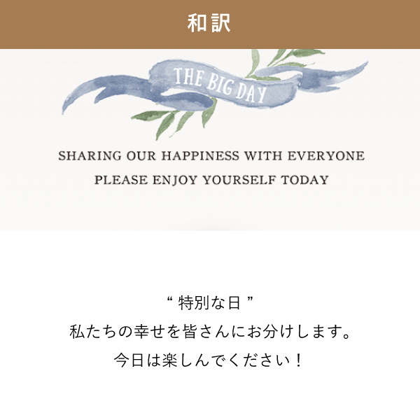 中央に入ったおふたりの名前、記念日がスタイリッシュで目を引きます。ナチュラル・ガーデンウェディングにおすすめ。