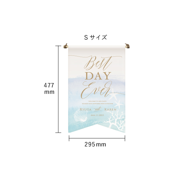ブルーのグラデーションに淡く描かれたサンゴ。まるで海の中を連想させるマリンテイストのウェディングフラッグ。