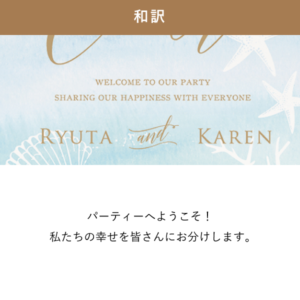 おふたりの名前、記念日が入ります。ゴールドの文字が上品さをプラスしてくれます。リゾートウェディングやサマーウェディングにおすすめ。