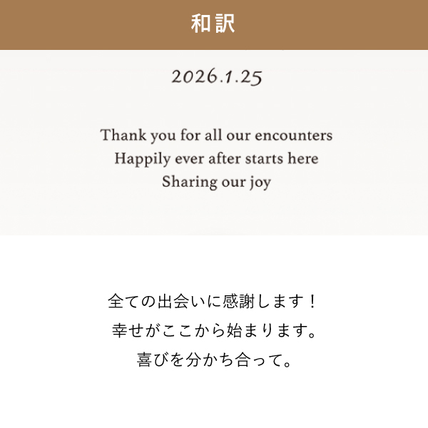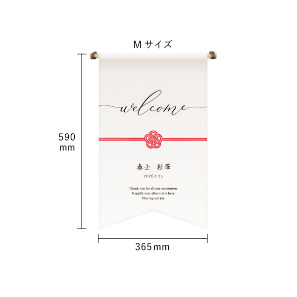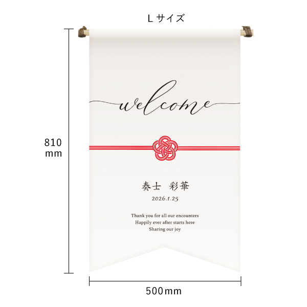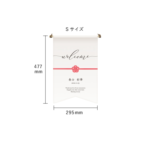 中央におふたりの名前、記念日が和文で入ります。英文を組み合わせることで抜け感をプラス。感謝の気持ちを込めたフラッグで、ゲストをお迎えしましょう。