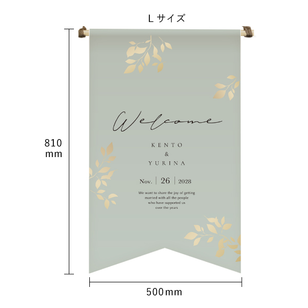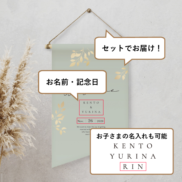 中央におふたりの名前、記念日が入ります。くすみグリーンカラーがリラックス空間を演出してくれるアイテムです。