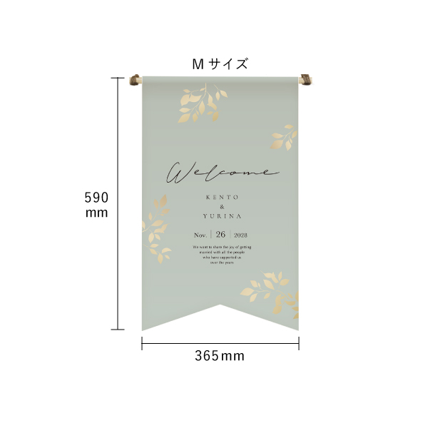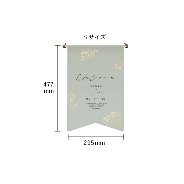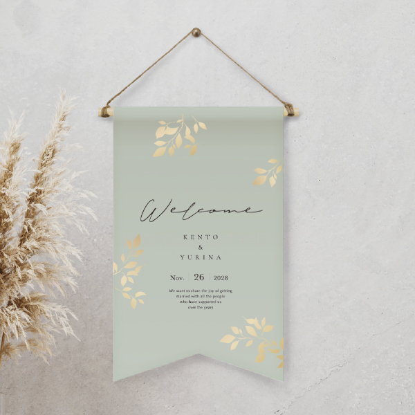 グリーンのくすみカラーが小枝のゴールドリーフとマッチしたウェディングフラッグ。ラスティックウェディングにもナチュラルウェディングにも合うデザインに仕上がっています。