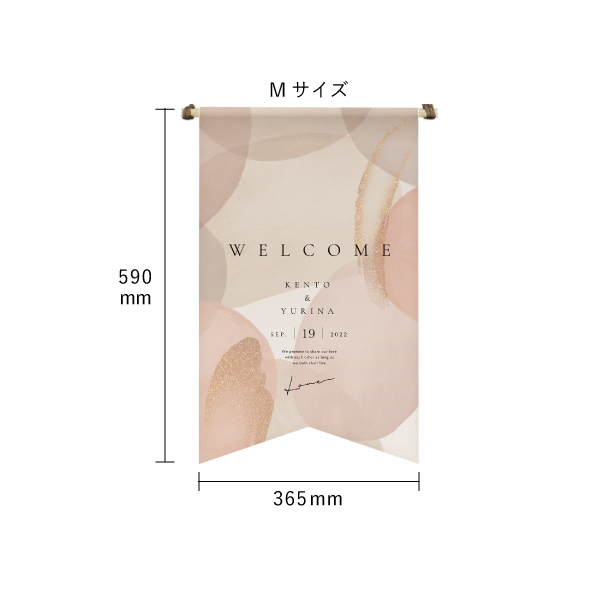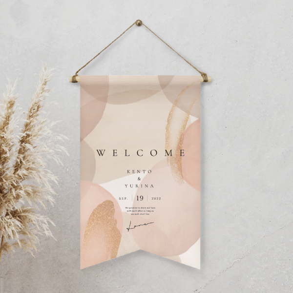 抜けるような透明感が魅了する淡い色合いのウォーターカラーに、グリッター風の光沢を感じるゴールドパールデザインのウェディングフラッグ。エレガントやアーバンテイストはもちろん、ナチュラルテイストにもマッチする大人な演出小物です。