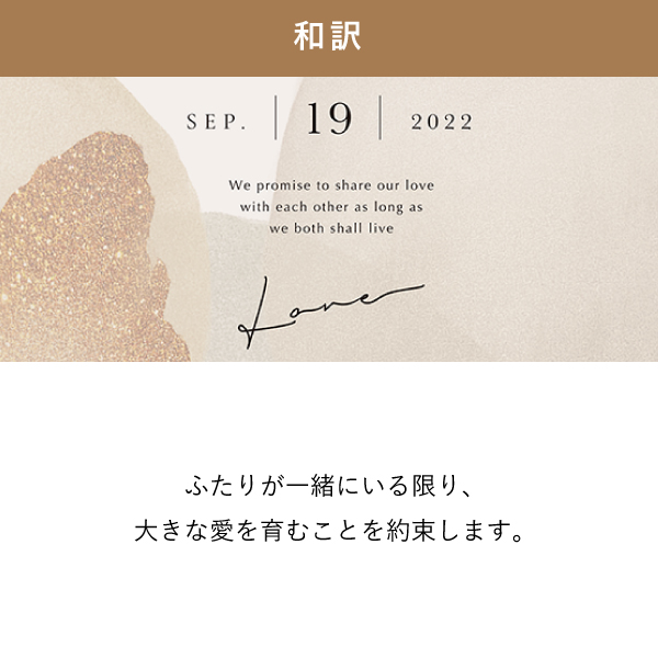 中央におふたりの名前、記念日が入ります。また、「ふたりが一緒にいる限り、大きな愛を育むことを約束します。」という英文が入り、おふたりのこれからを思う強い意志が込められています。