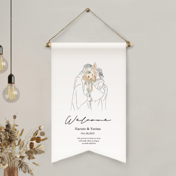和モダンを感じる、ラフなイラストのデザインが目を惹くウェディングフラッグ。海外ウェディングで人気なウェディングアイテムに和のテイストが加わり、おふたりのセンスを際立たせる一品。