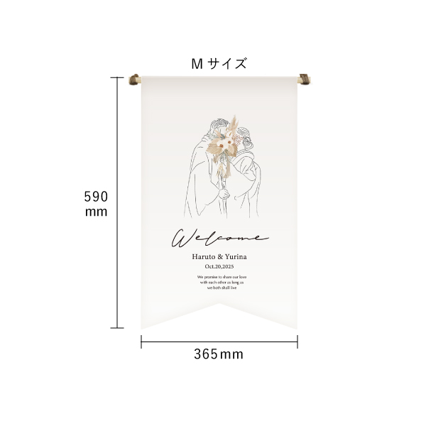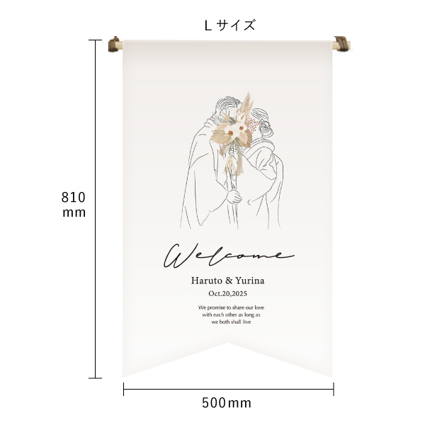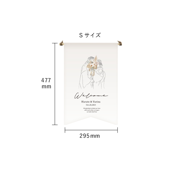 ウェルカムスペースや高砂では大き目のLサイズ、受付やエントランスには主張しすぎないMサイズ、前撮りやフラッグボーイ・フラッグガール用には小さめのSサイズがおすすめです。