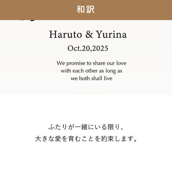 おふたりの名前、記念日が入ります。また、「ふたりが一緒にいる限り、大きな愛を育むことを約束します。」という英文が入り、おふたりのこれからを思う強い意志が込められています。