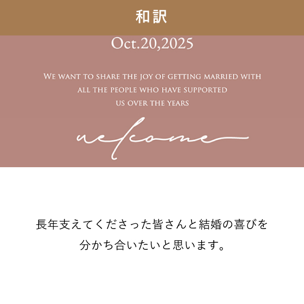 「Welcome」の文字と「おふたりのお名前」「記念日」が入る、スタイリッシュなデザインのウェディングフラッグで、中央には「今まで私たちを支えてくれた皆様と一緒に結婚の喜びを分かち合える事を願って…」と英文が入り、結婚式の大切な一日への思いがつのります。くすみカラーで、可愛らしさの中に大人っぽさも感じられるデザイン。おふたりのさりげないセンスが感じられます。