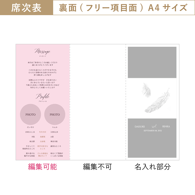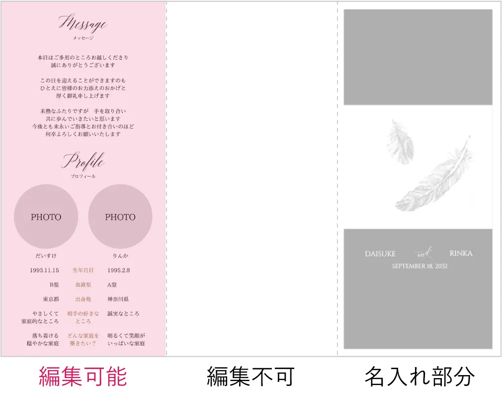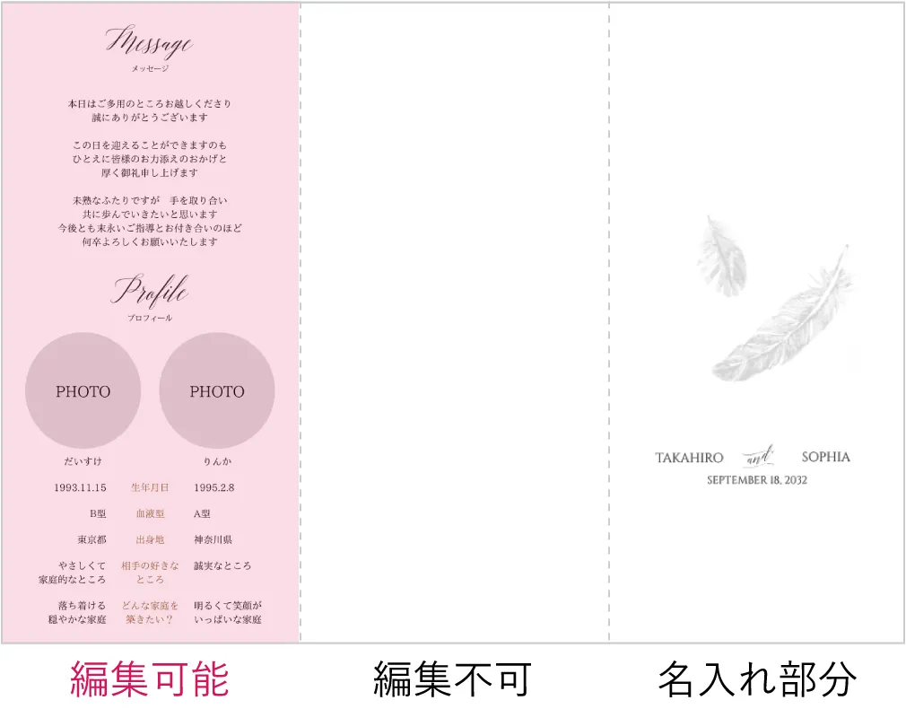 おしゃれで可愛くて一目惚れでした! 羽と金色の文字や柄がとても高見えします! 親戚友達みんなに大好評でした! 「めちゃかわいいね!どこの招待状にしたの?!ぶっちゃけ高かったでしょ〜笑!」って言われました!!! 招待状・席次表・席札セットのものを購入したので、とっても安かったです!!