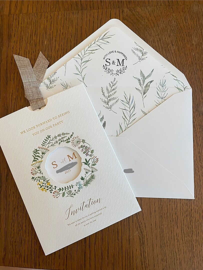 紙もしっかりしていて、箔押しの文字、お花の部分はぷっくりと加工がしてありとても可愛かったです。 印刷済みで注文しましたが、それぞれバラバラの状態で届くので、ある程度自分で作業する時間を見越して注文されると良いかと思います。 特にリボンを通す工程はコツを掴むまで少し時間がかかります。 招待状から当日の席次表・席札まで一貫してそのデザインなので、このデザインを中心にしてテーブルコーディネート等選びました。 さわやかでナチュラルな式にしたかったのでぴったりでした。満足しています(^ ^)