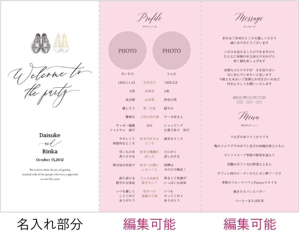 とても可愛くて大満足です!!! 印刷申し込みから3.4日程度で商品が届き、余裕を持って自分達でセットすることができました! 紙の質も高くしっかりとしていて、高級感がありました。式場で頼むより気に入ったデザインで、しかも安く作ることができ節約にもなりました。 ありがとうございました!