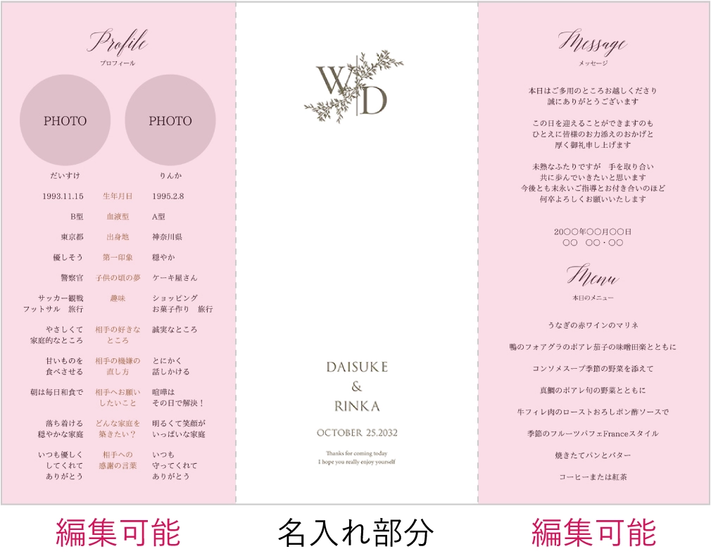 紙の材質は、どうしても式場で頼むものよりは劣ってしまうが、茶色の巻き紙や革紐には高級感があってよかった。 席次表に関しては、2人のプロフィールや当日のメニューなどが自由度高くデザインできて、オリジナリティが出せたのがありがたかった。スマホでいつでも簡単に編集できたのも非常に満足している。 ただ、「W/D」がなんの略なのか、ゲストが初見ではピンとこなあと思うので、新郎新婦のイニシャルにカスタマイズできたりすると尚のことよい。総合的にはかなり満足です。