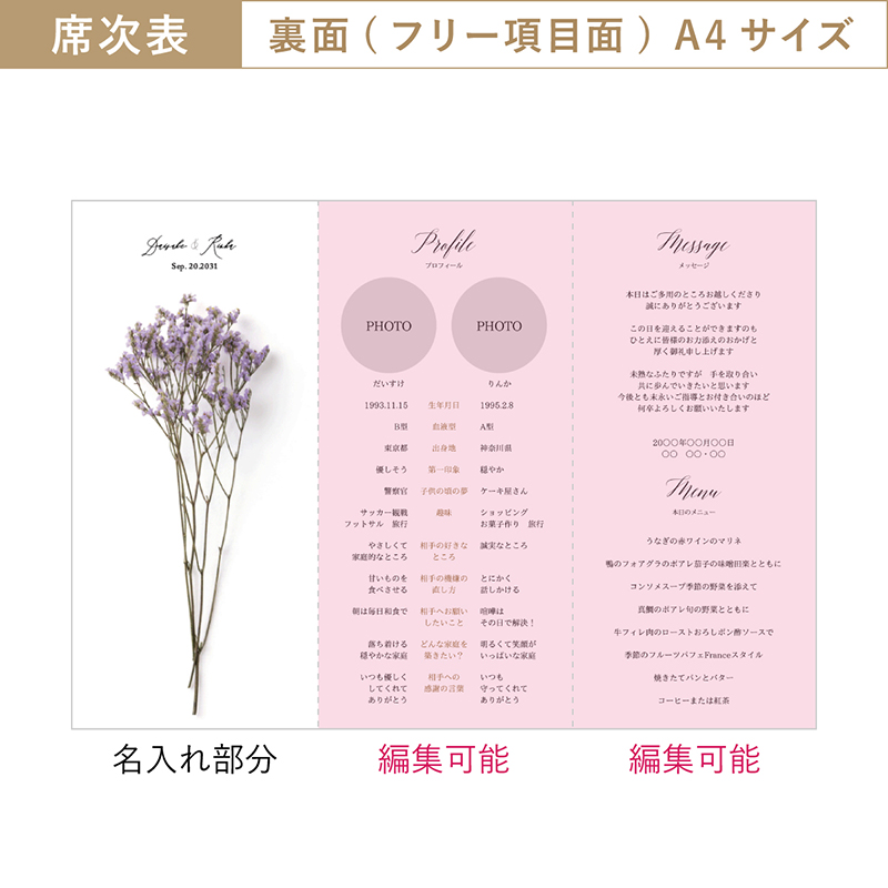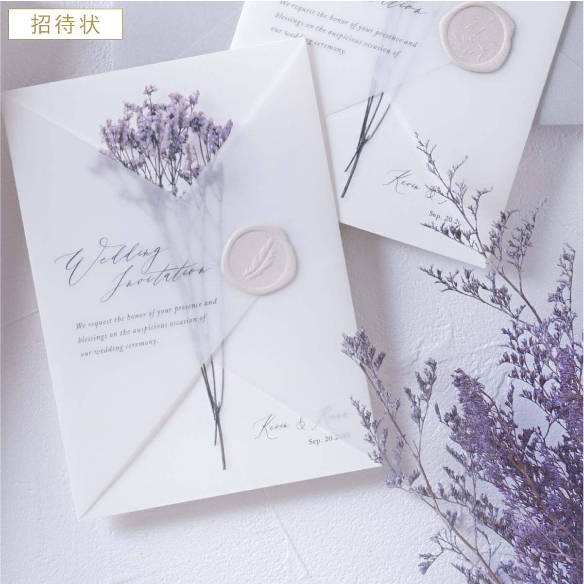 花言葉が気に入って「スターチス」のデザインを希望して、彼が席次表をロールに丸めてるのがなんかおしゃれ!という理由で選びましたがこんなにも細かく自分でオリジナルの編集ができると思っていなかったので届いてみて大満足。 招待状を受け取った方から「あなたらしい素敵なデザイン」と言ってもらえたのが嬉しかったです。 予備で何部か入れてくれてたお気遣いも嬉しかったし、プレゼントで席札がついてたりしたのもありがたかったです。