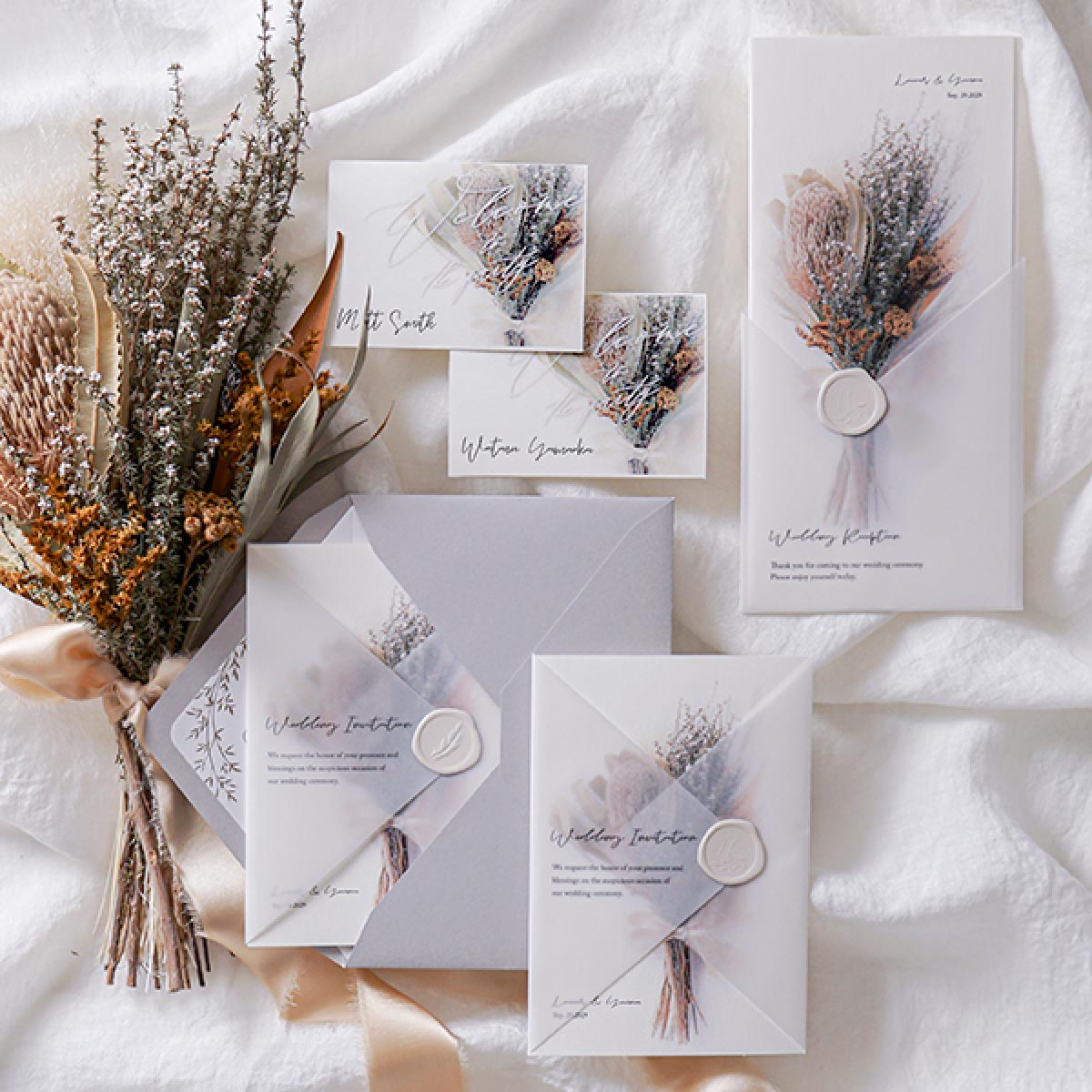私が思っていた披露宴式場のテーマカラーと、シャルムドブーケのデザインがマッチしていてこれを選びました。テーブルコーディネートはシンプルなものが良かったので、席札だけドライフラワーの柄のない無地のものに変更しましたが、こうやって一部だけ変更できたのも良かったです!