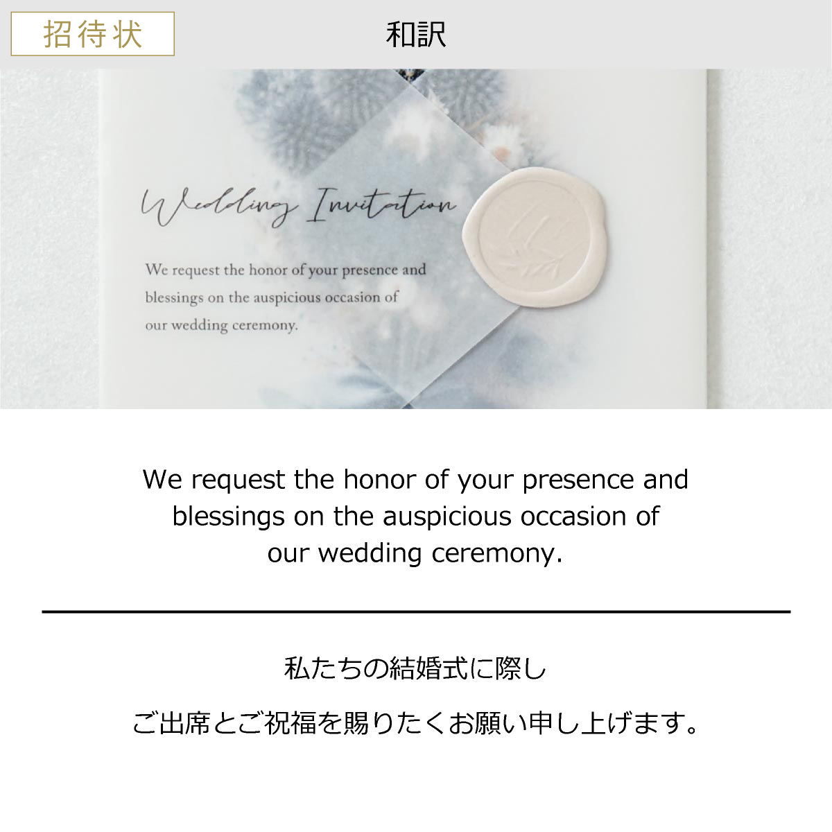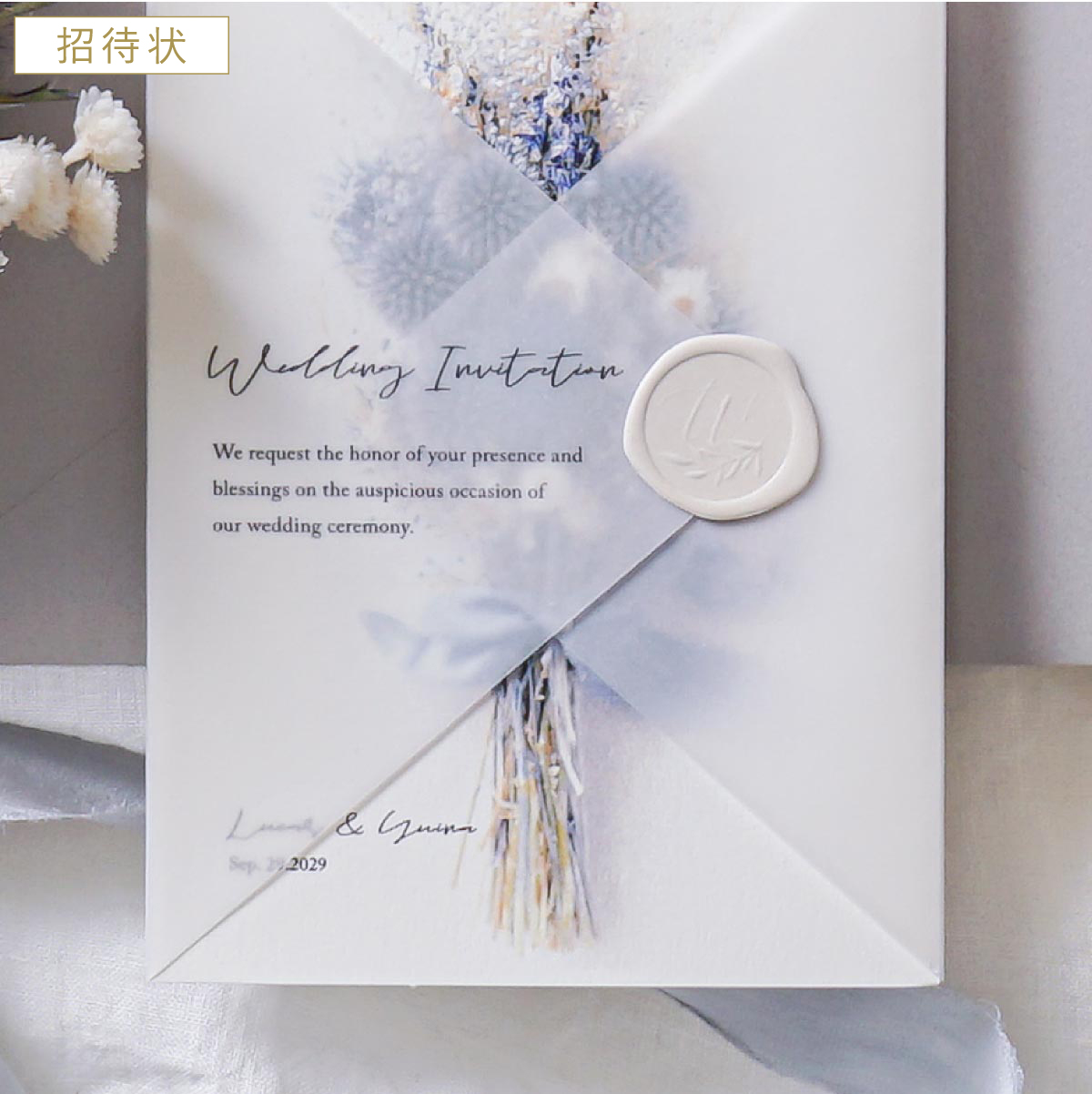 お花の写真が可愛くて選んだシャルムドブーケシリーズ。 立体的なデザインのものと比べて、 平面のお花がどう見えるかなと思っていましたが、実際に届くと青い色が綺麗に印刷されていて外の透けた紙も合わさってとても可愛くて大満足です! 紙の招待状とWebの併用だったのですが、 親切に注文の仕分け方法や部数の変更などにも対応していただきありがたかったです。