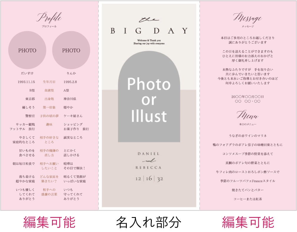 席次表にメニュー等も入りますが、受付で渡す席次表とは別に作成すると、ゲストのテーブル演出をランクアップできます。