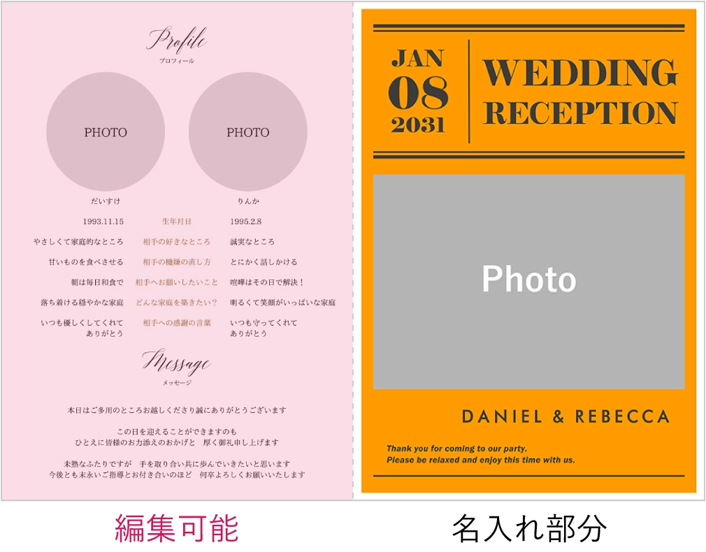 挙式日と新郎新婦さまのお名前、写真が入れられます。