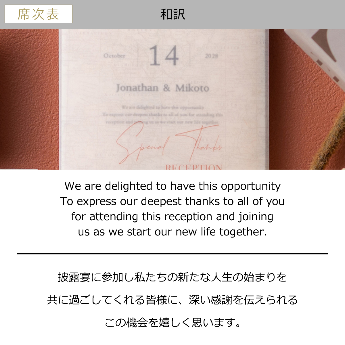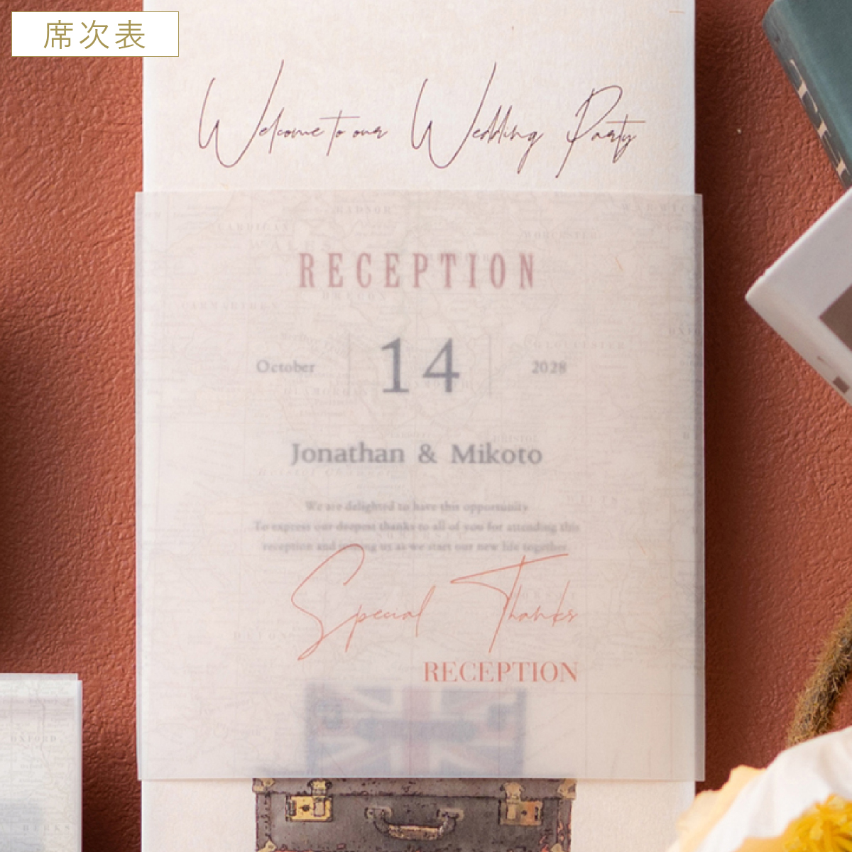席次表にメニュー等も入りますが、受付で渡す席次表とは別に作成すると、ゲストのテーブル演出をランクアップできます。