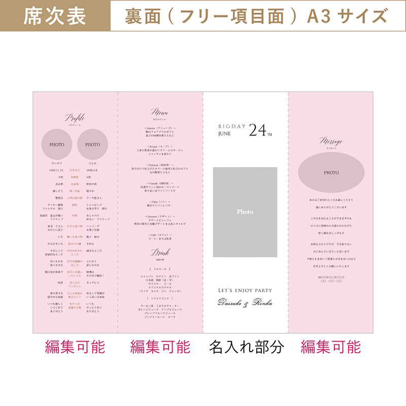 席次表にメニュー等も入りますが、受付で渡す席次表とは別に作成すると、ゲストのテーブル演出をランクアップできます。