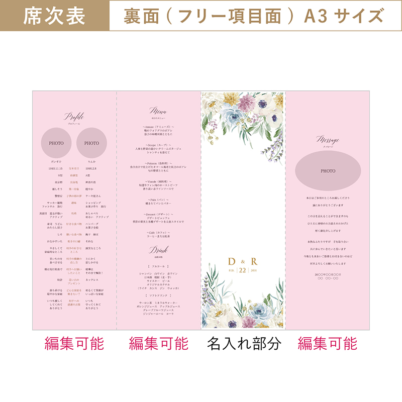 席次表にメニュー等も入りますが、受付で渡す席次表とは別に作成すると、ゲストのテーブル演出をランクアップできます。