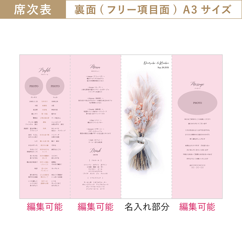 席次表にメニュー等も入りますが、受付で渡す席次表とは別に作成すると、ゲストのテーブル演出をランクアップできます。