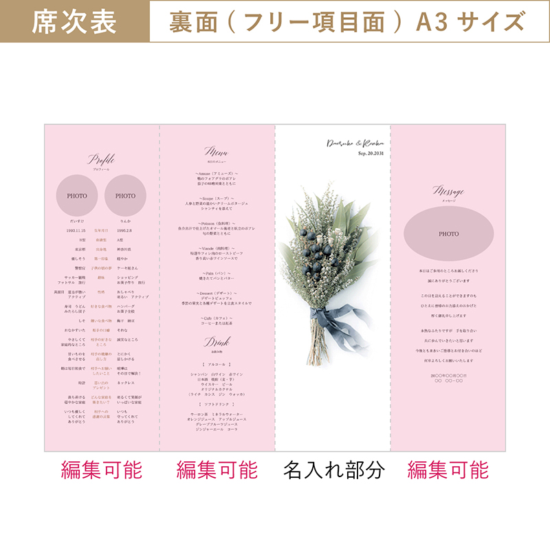 席次表にメニュー等も入りますが、受付で渡す席次表とは別に作成すると、ゲストのテーブル演出をランクアップできます。