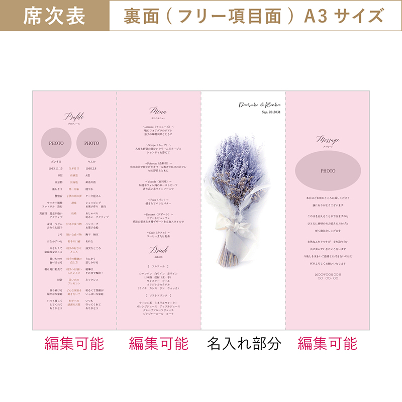 席次表にメニュー等も入りますが、受付で渡す席次表とは別に作成すると、ゲストのテーブル演出をランクアップできます。