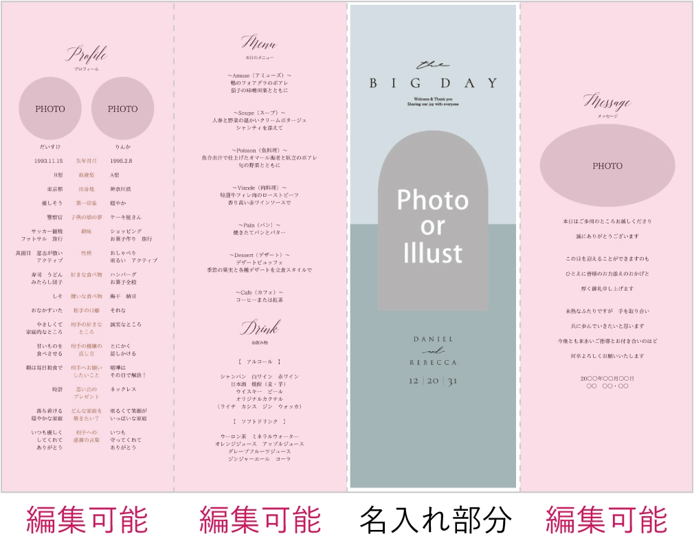 席次表にメニュー等も入りますが、受付で渡す席次表とは別に作成すると、ゲストのテーブル演出をランクアップできます。