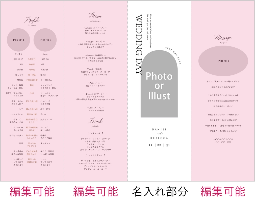 席次表にメニュー等も入りますが、受付で渡す席次表とは別に作成すると、ゲストのテーブル演出をランクアップできます。