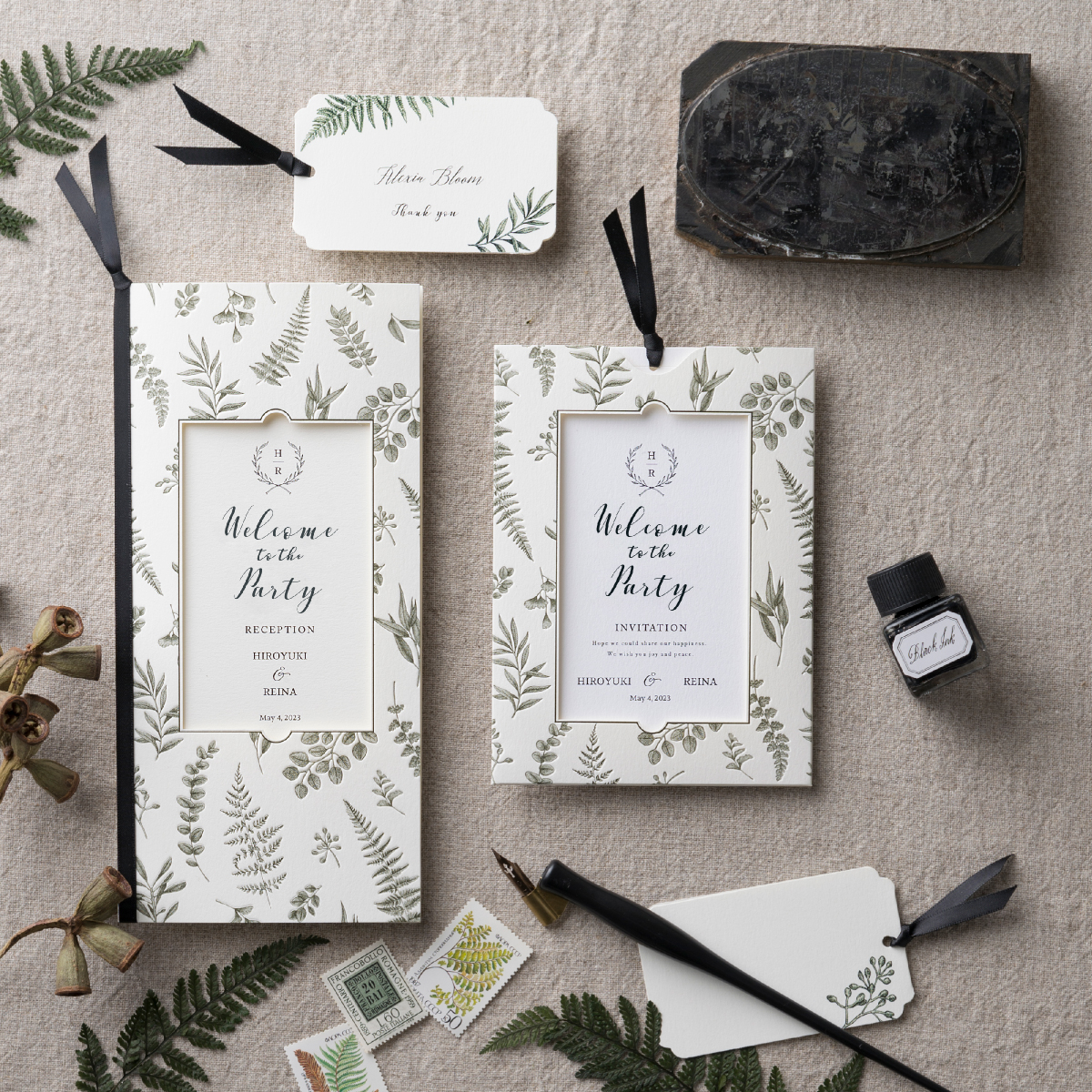 先ほどこちらのセットが届きました! サンプルをいただいて実際に見ていたからこそ満足のいくペーパーアイテムを選ぶことができました! 飾り紙も無料でついてくる席札も自由に選ぶことが出来たしイニシャルスタンプも可愛らしくてお気に入りです!ありがとうございました!これから招待状と席次表を作るのが楽しみです!