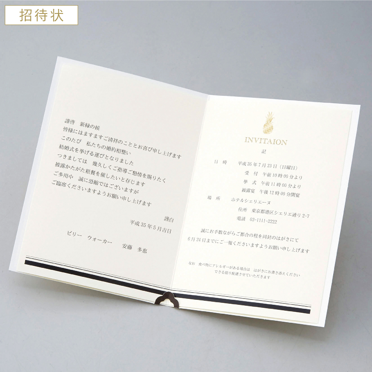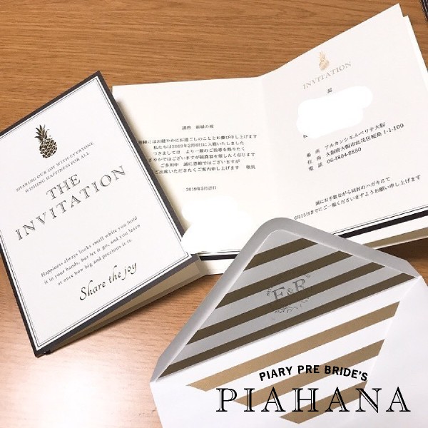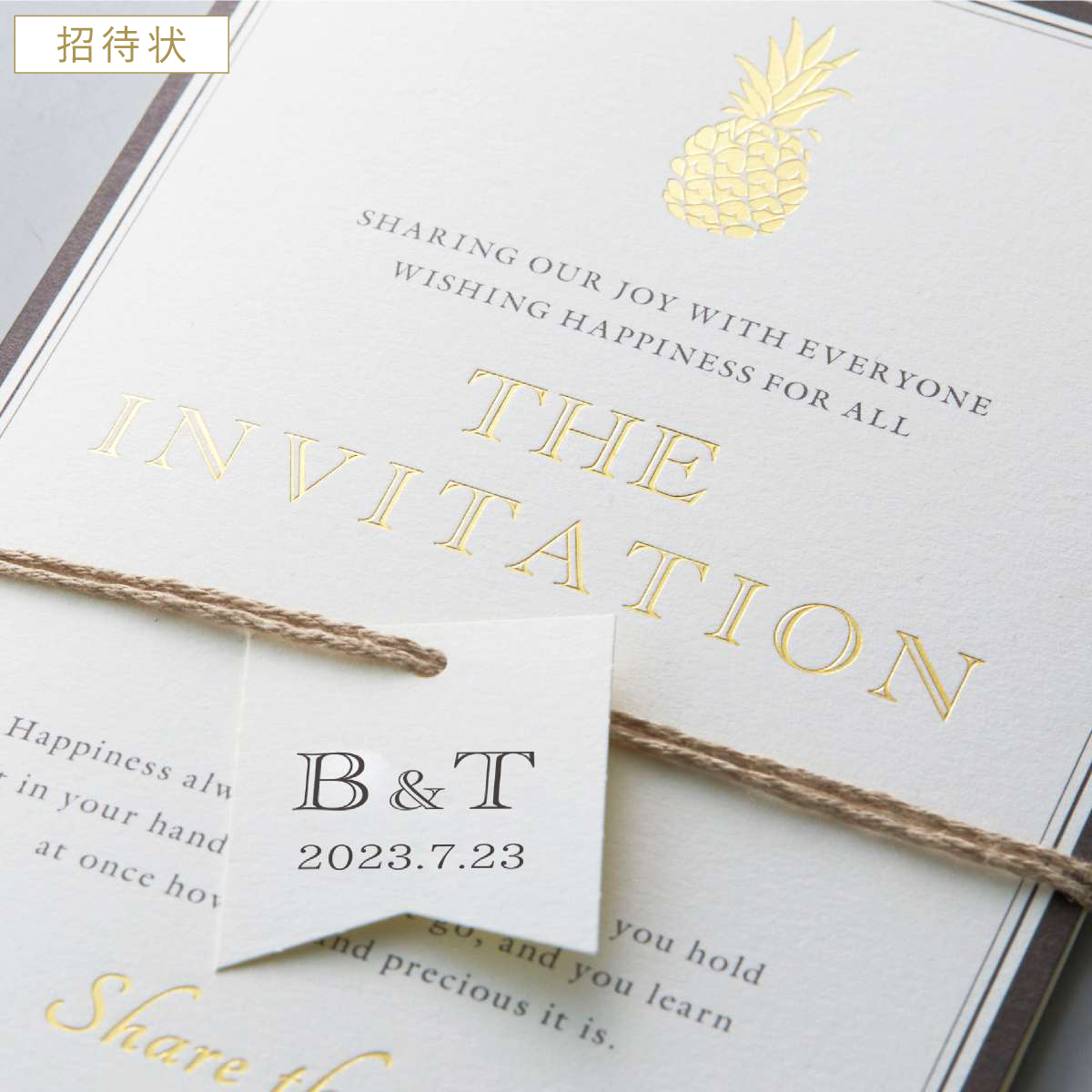 パイナップルの部分がゴールド素材なのがオシャレで気に入りました! 麻紐は可愛いけれど結ぶのが手間なので沢山招待状を出される方は要注意です。